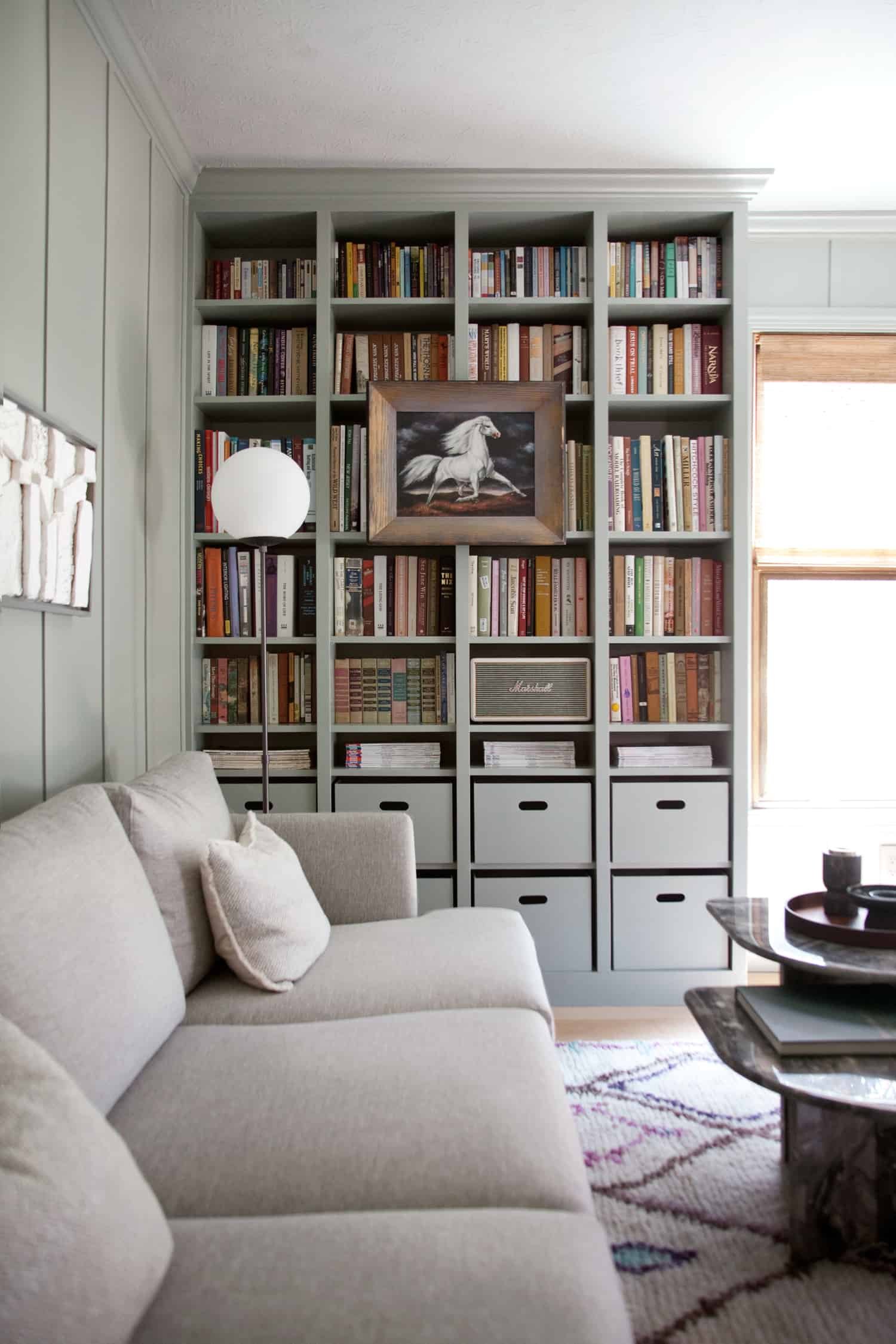 My favorite Billy bookcase hacks include this chic painted bookcase by Malcom Begg, Jenny Komenda’s arched bookcase creation, and this built-in Billy bookcase hack complete with a ladder.
