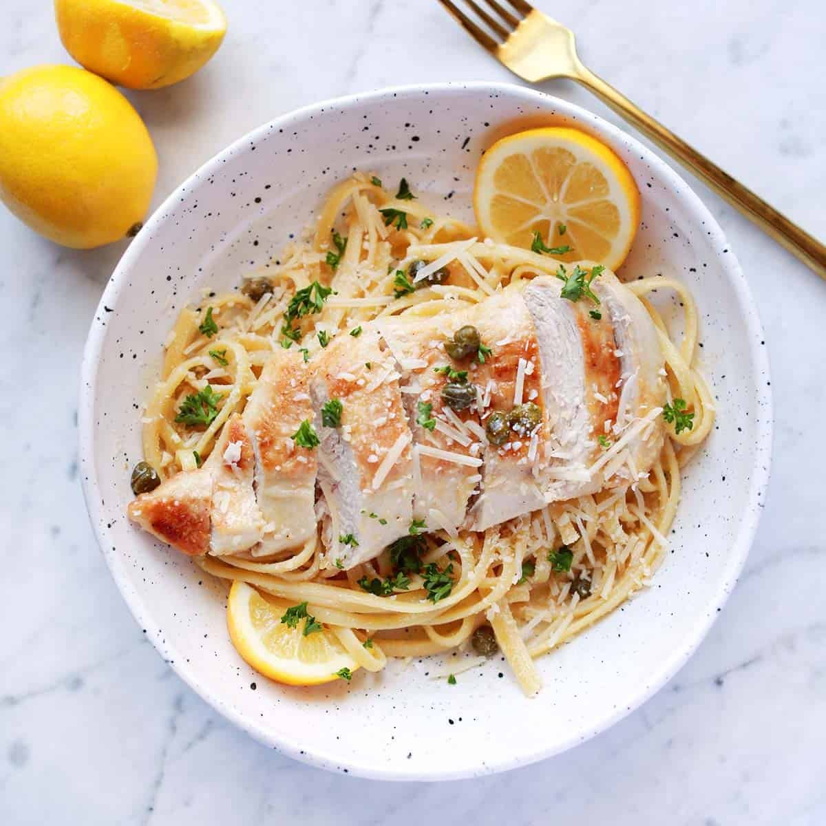 My favorite way to plate this is to toss the pasta in the piccata sauce (using tongs), then I plate the pasta, slice the chicken and add it over the top. And lastly, I drizzle or spoon the remaining sauce from the pan over the chicken.